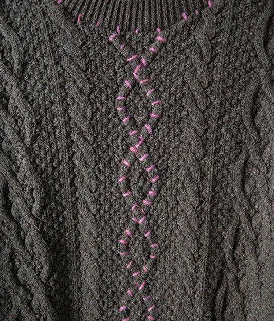 Pink Stitched Cotton Cableknit Crew Sweater, Large