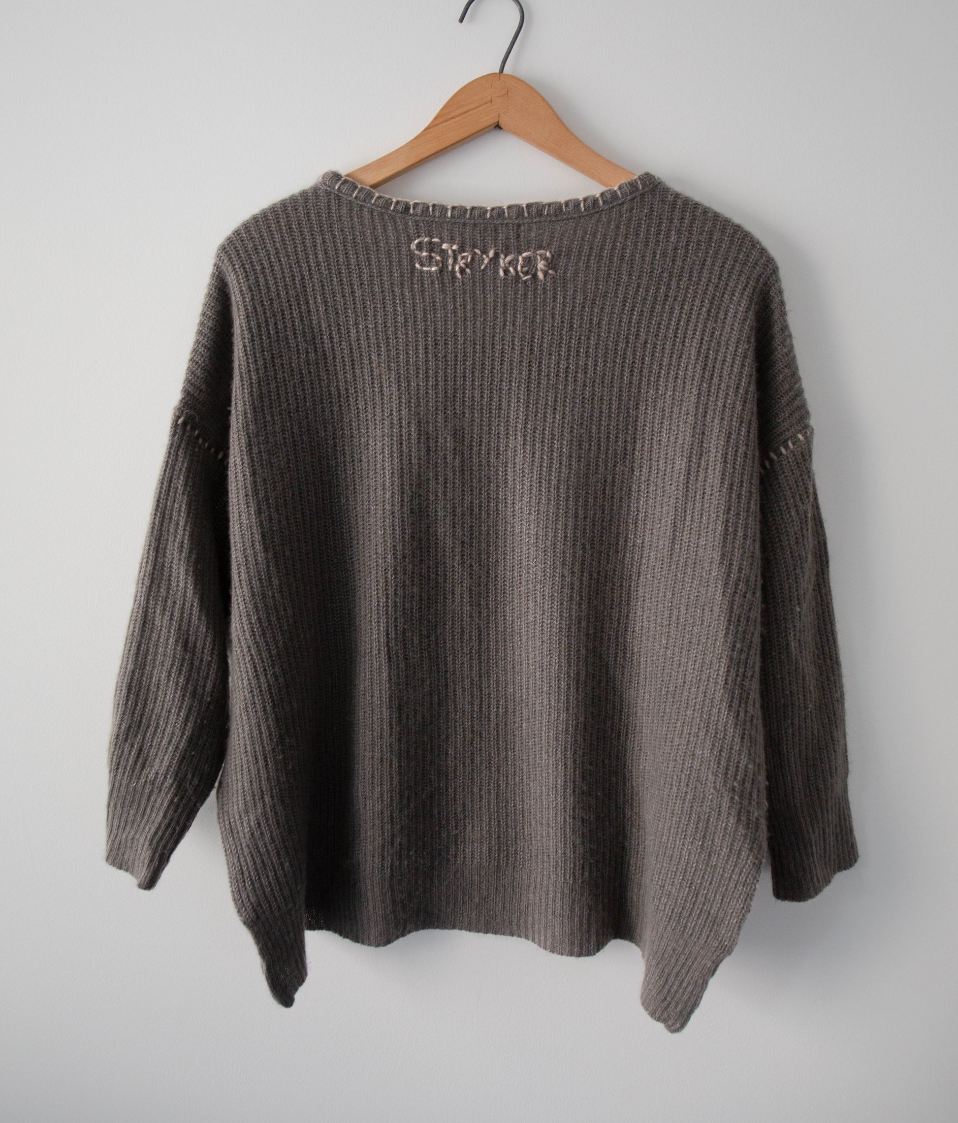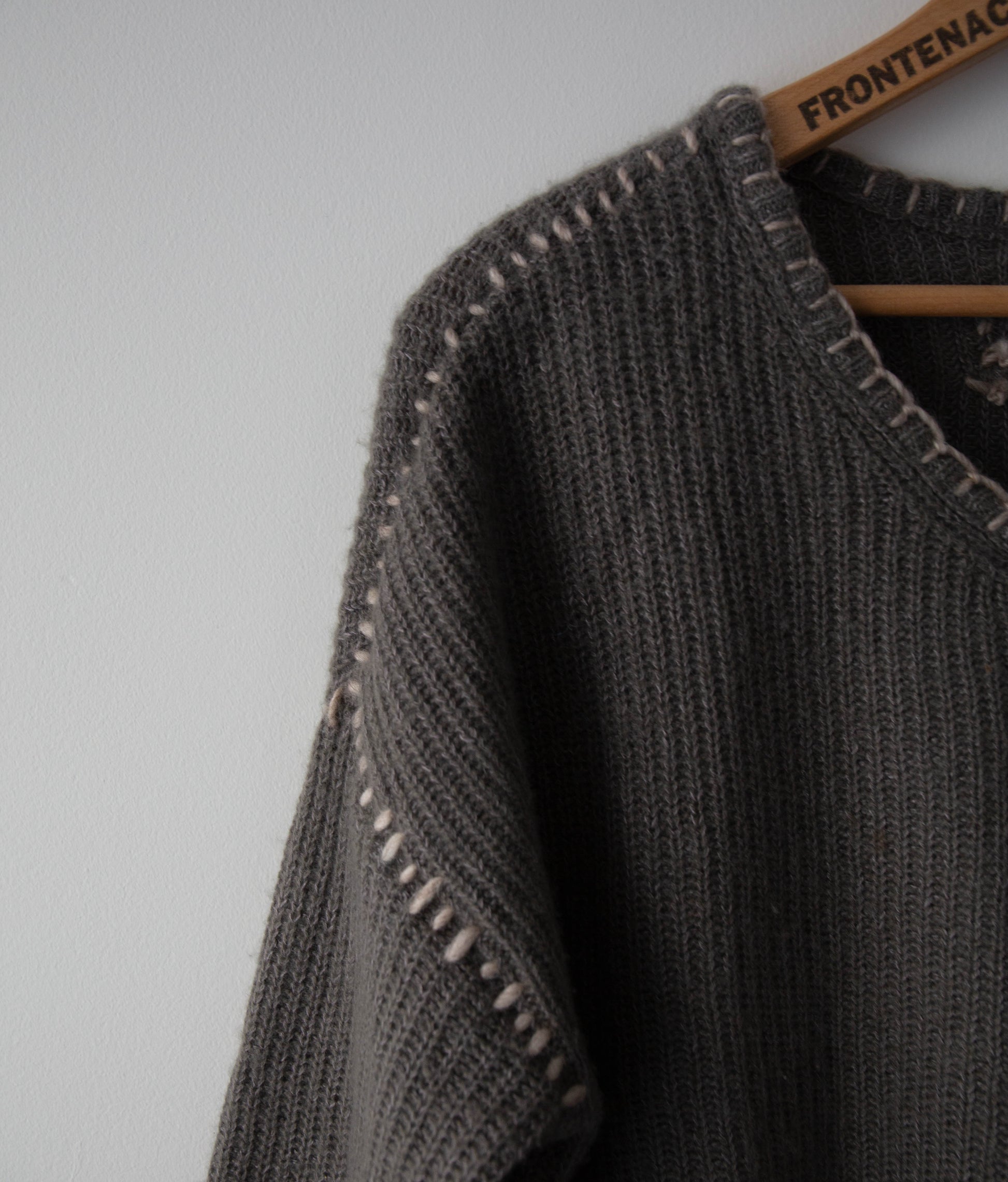 This one-of-a-kind cashmere/linen sweater has been upcycled by hand with a blanket stitched design. It features cropped sleeves and a drop shoulder design with a slightly higher length in the front than the back. The knit is quite delicate.
