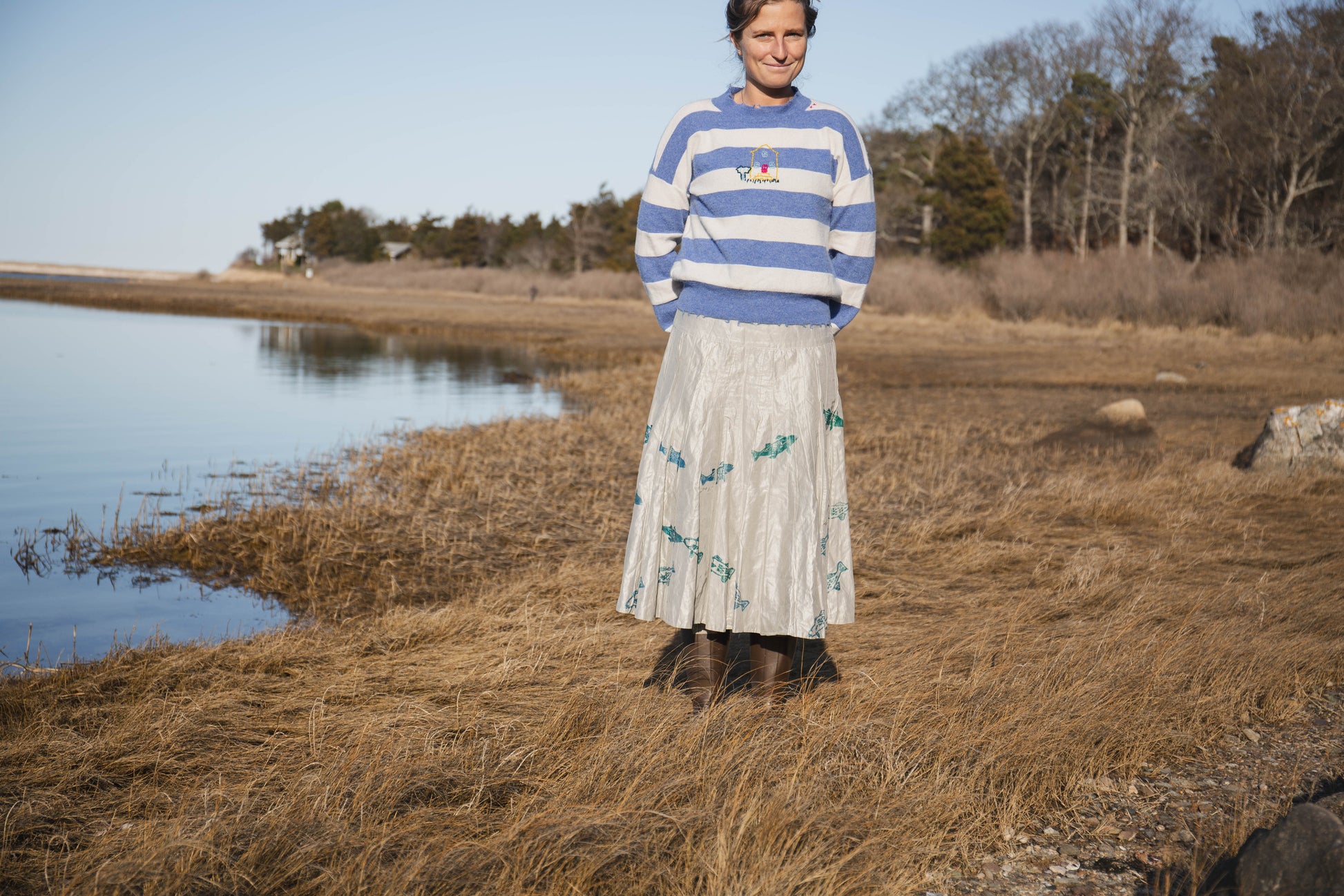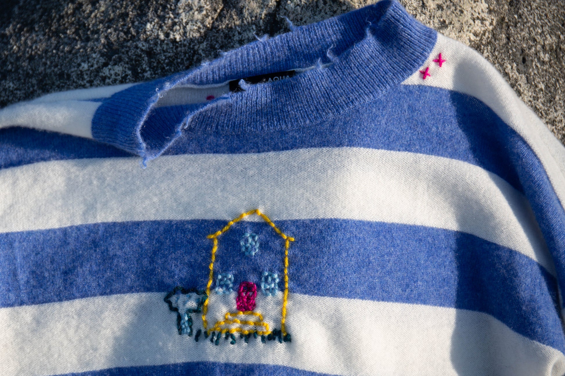 This upcycled sweater is made of 100% cashmere and features a striped pattern, frayed edges, and has been stitched with a very sweet illustration of a house. I believe that I was inspired by this, because I'm currently renovating a family home, and feeling the need to nest. In a way, I am also longing for my own home.
