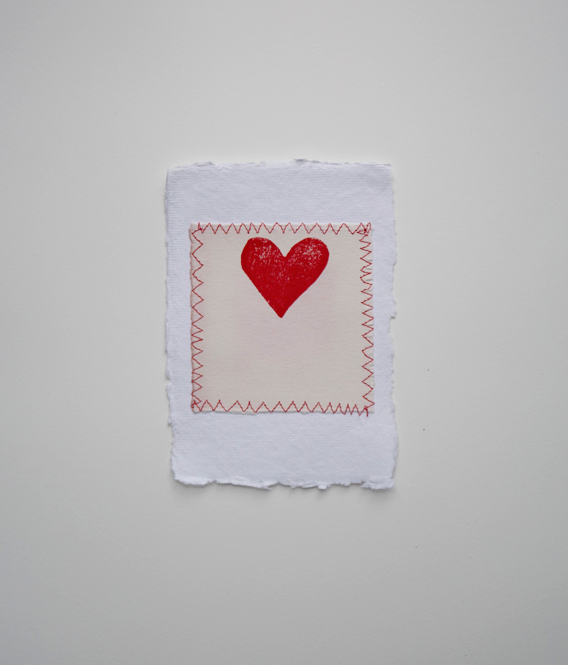Made entirely by hand with lots of love! Beginning with handmade cotton rag paper sourced from Etsy, I then dyed a sheet of cotton printmaking paper with beets, dried them, and tore them into little squares, which I then ran through the sewing machine for a zig-zag stitched detail, and finally block printed with a linocut.