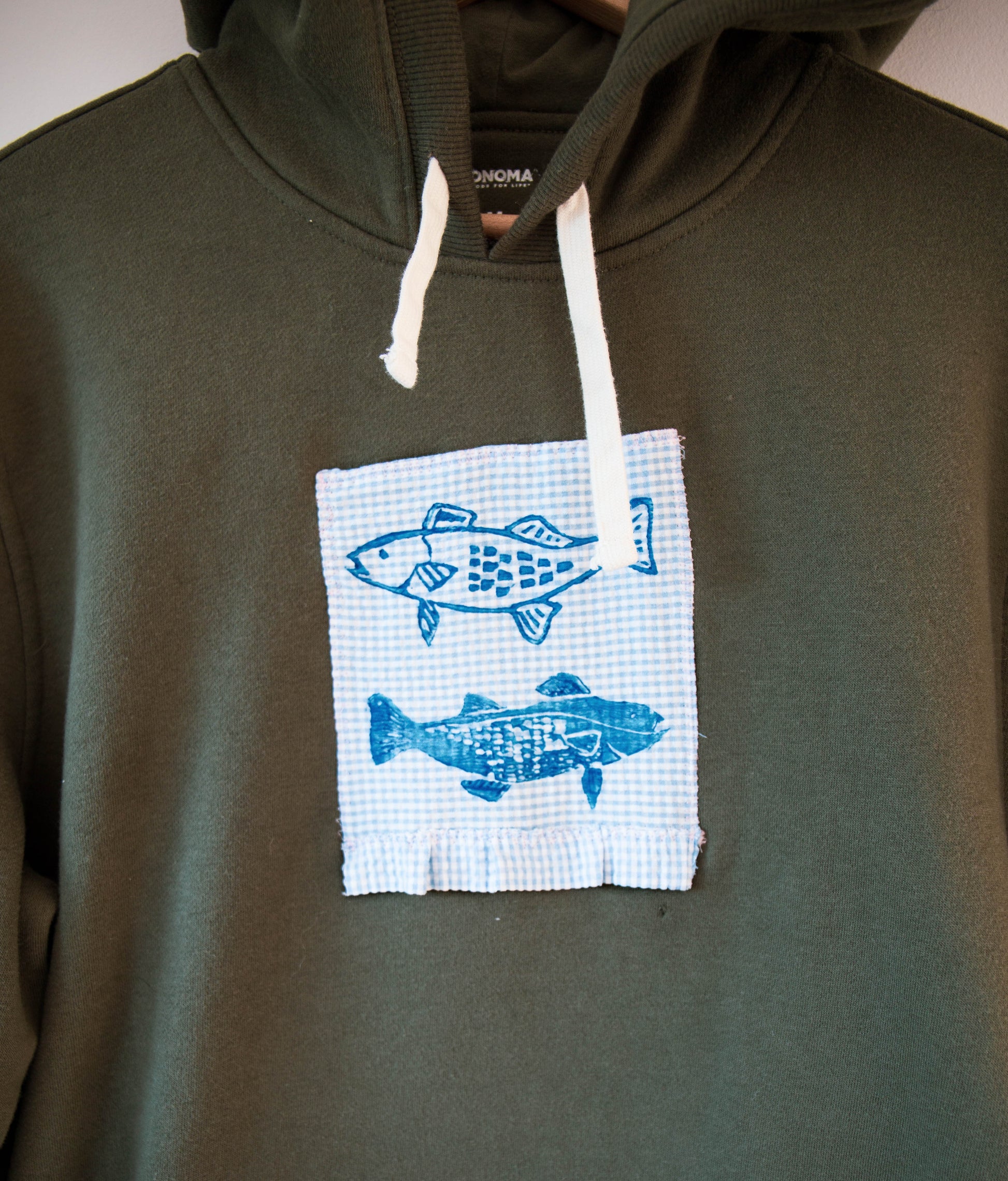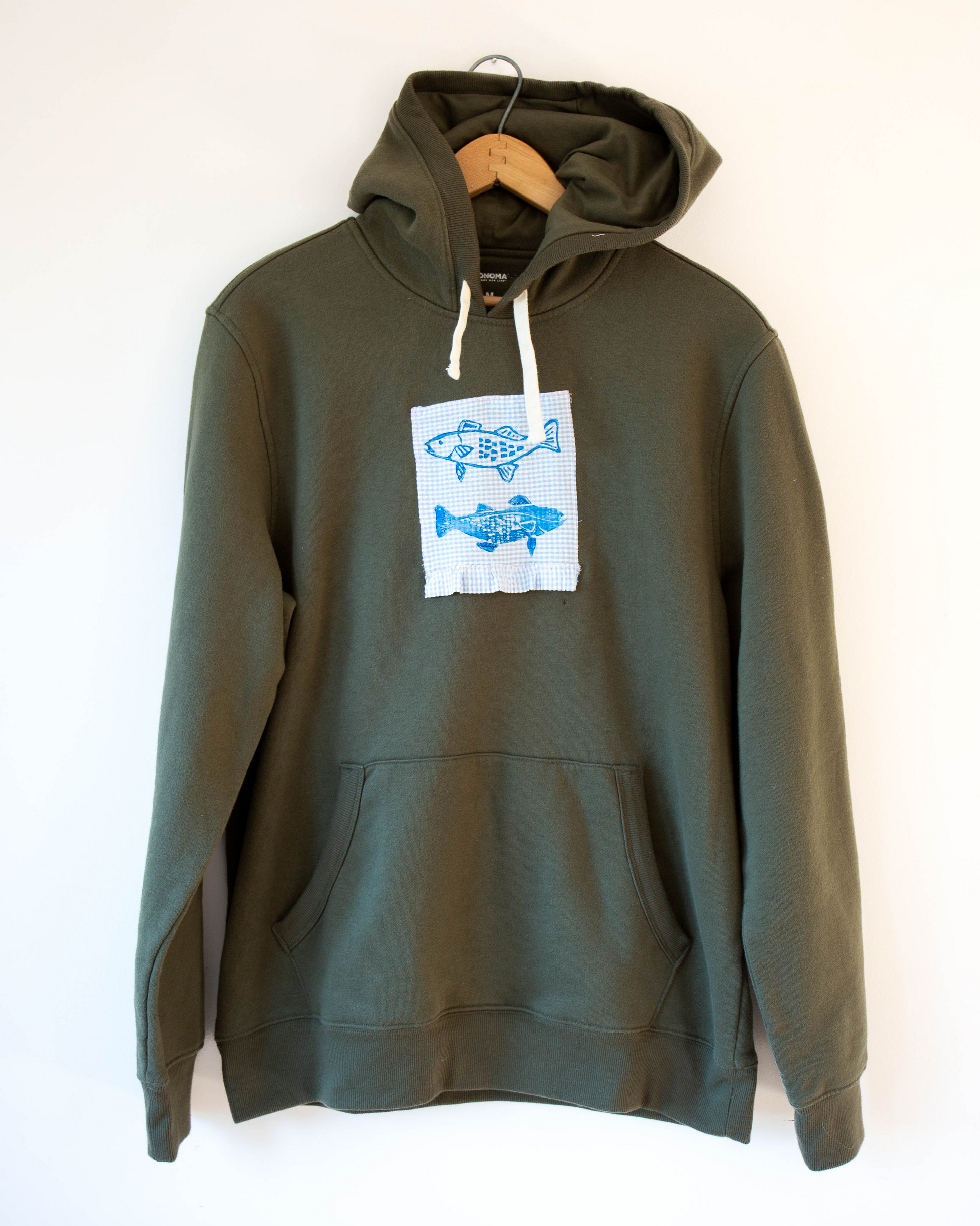 Upcycled, one-of-a-kind. Block print on upcycled fabric. Slightly crooked, the way I love art!