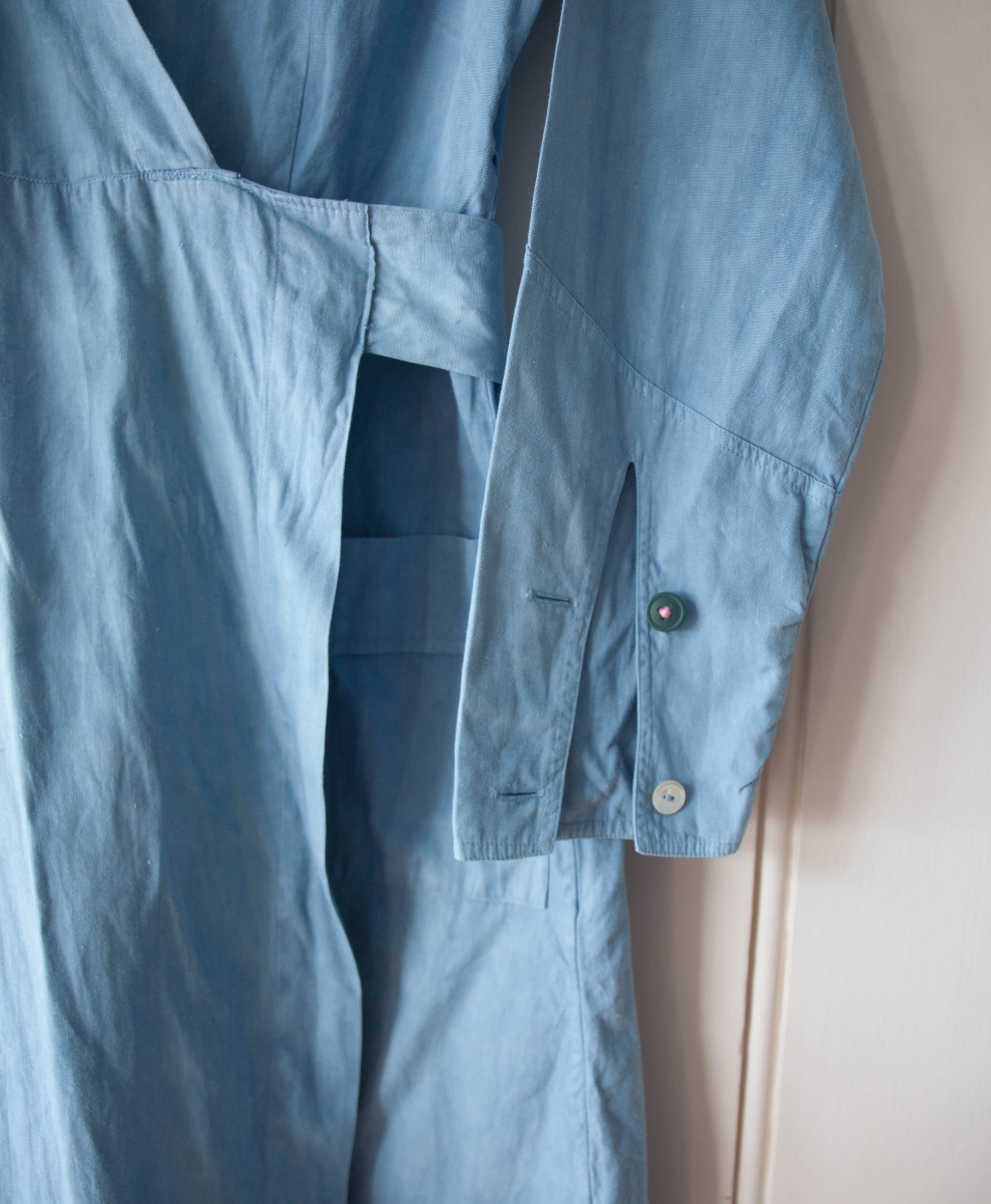 I found this piece at the 2025 Brimfield Flea Market on a vintage rack. It's a cotton wrap work dress, but could also be worn as a light jacket. Hand-dyed with all natural indigo, this piece is truly one-of-a-kind.