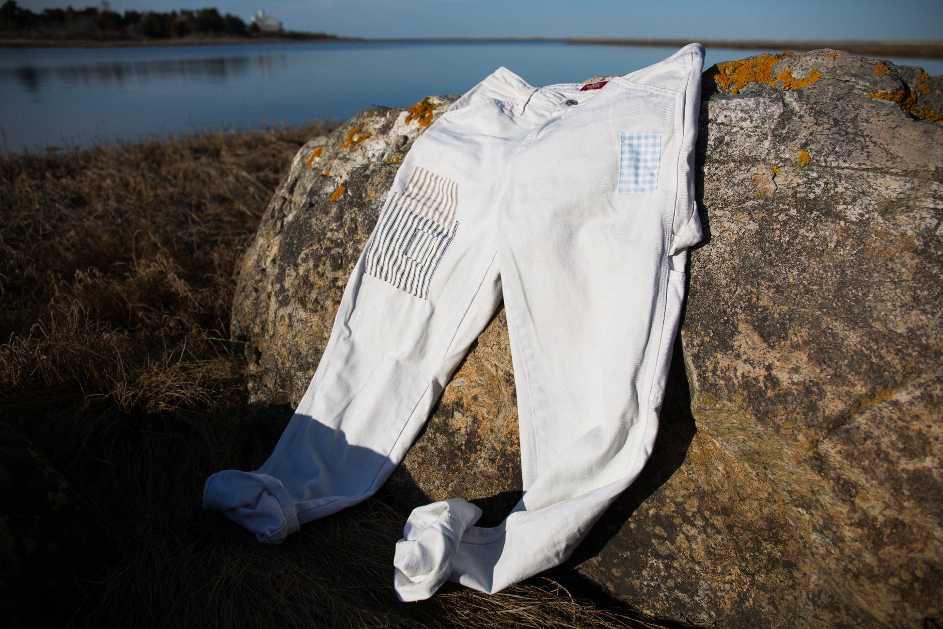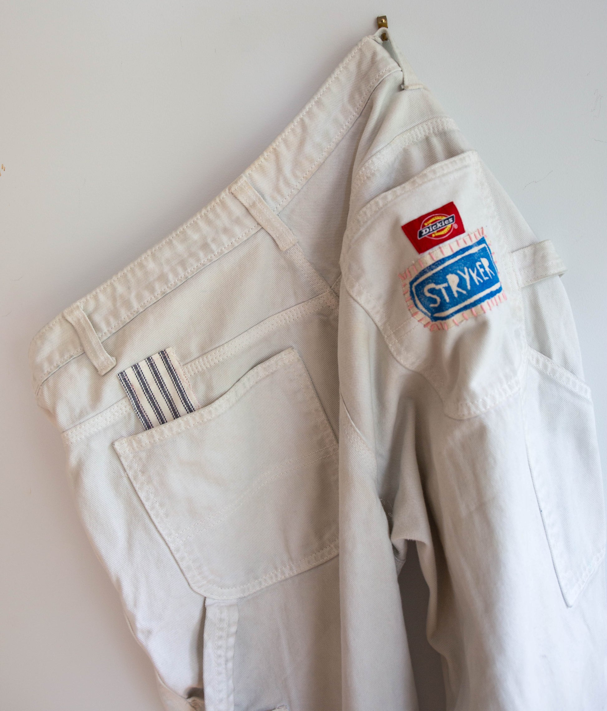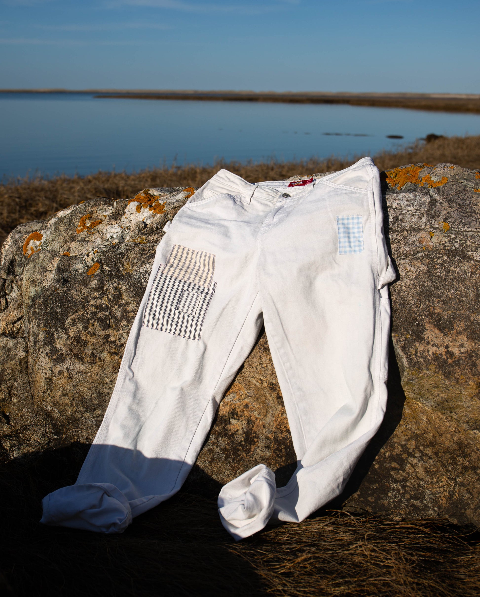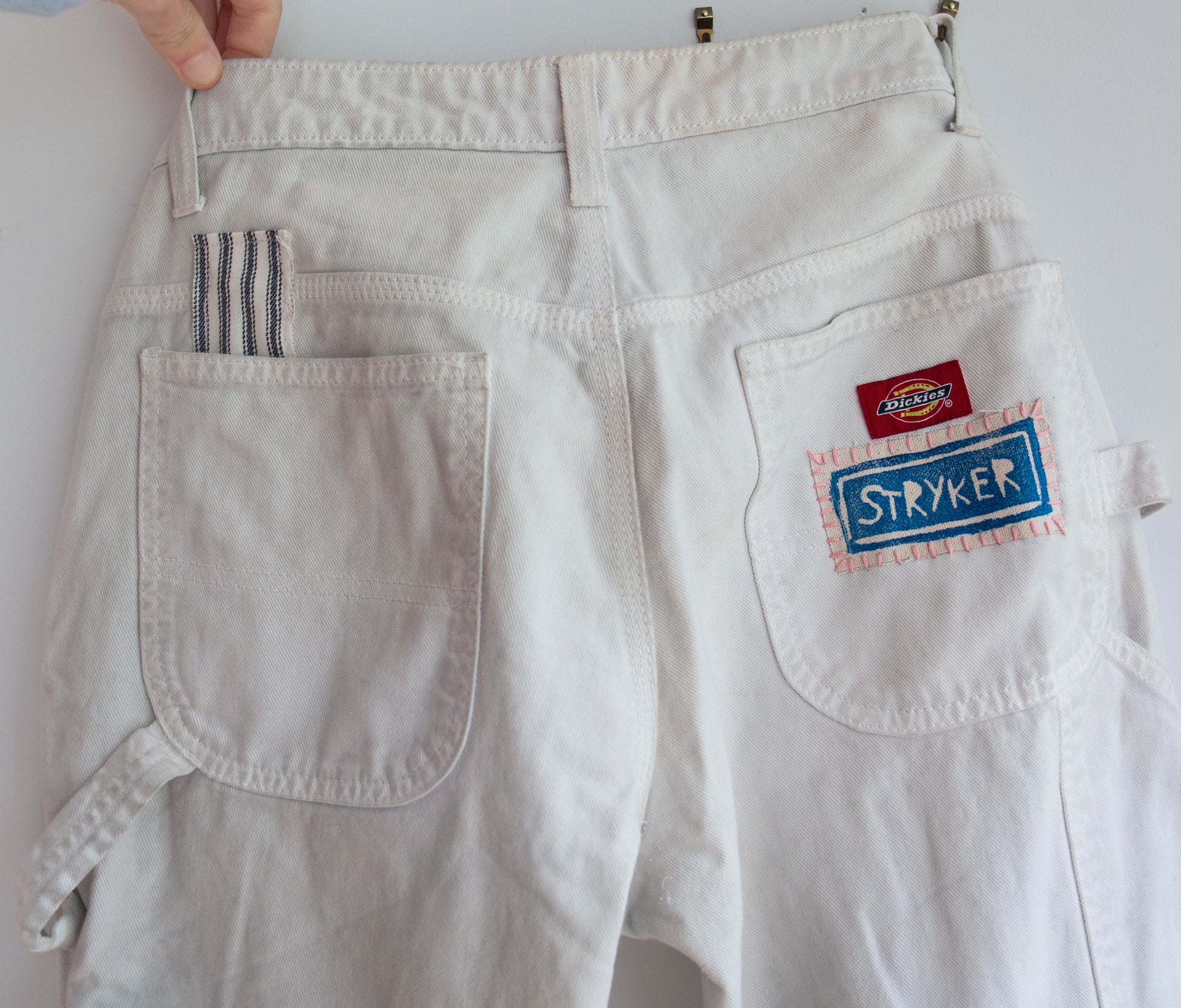These thrifted Dickies have been upcycled with patchwork using recycled fabric. The navy ticking stripe has been donated by a friend, from her unused stock pile of fabric rolls, and the gingham is vintage cotton found on Etsy.